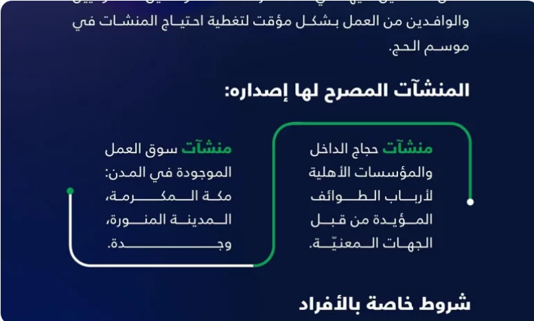 ويأتي ذلك ضمن جهود الوزارة في تنظيم العمل خلال موسم الحج، والتسهيل على المنشآت والعاملين المشاركين، والارتقاء بمستوى الخدمات المقدمة لضيوف الرحمن وتحسين تجربتهم خلال الموسم المبارك.