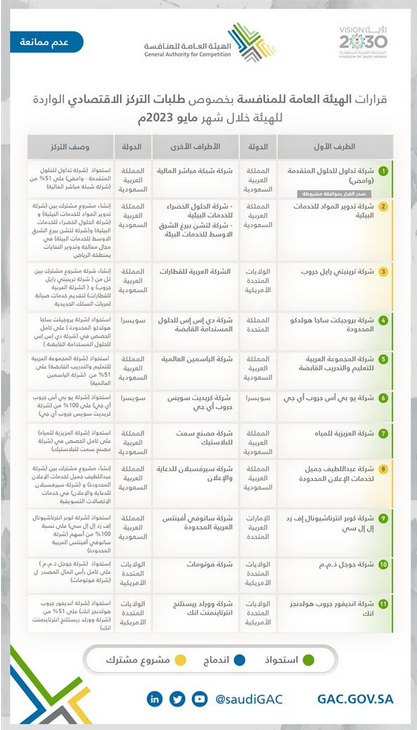أعلنت الهيئة العامة للمنافسة، إصدار 11 قراراً بخصوص طلبات التركز الاقتصادي الواردة إليها خلال شهر مايو لعام 2023م.
