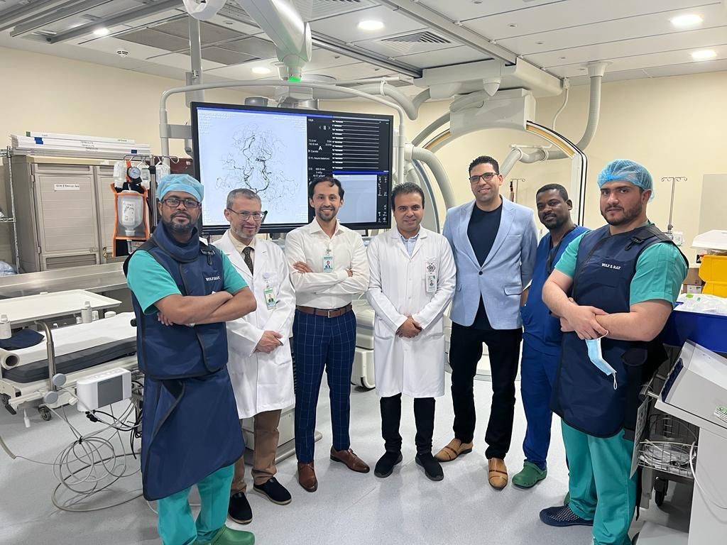 والذي ساهم بعد الله في إنقاذ حياة المريض الأربعيني الذي كان يعاني من ضعف في الشق الأيمن بسبب جلطة دماغية حادة إثر تضييق شديد في الشريان الدماغي ،وتم عمل الإجراء الطبي بتوسيع الشريان ،وتركيب دعامة دماغية طبية خاصة بشكل عاجل.