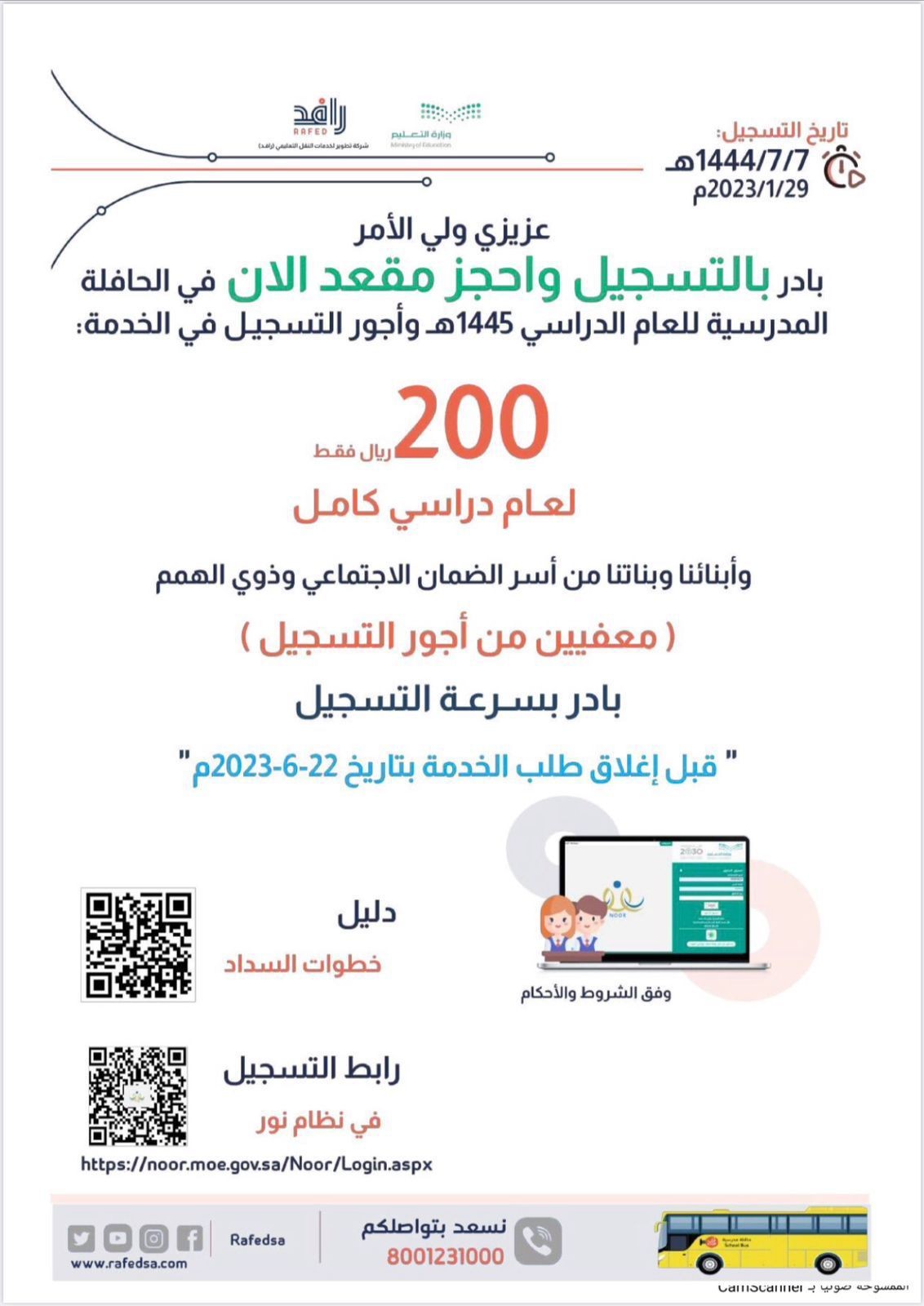 ودعت الإدارة أولياء الأمور إلى سرعة التسجيل عبر الدخول على نظام نور لأولياء الأمور واستكمال الإجراءات النظامية للتسجيل خلال الأيام المقبلة والاستفادة من المقاعد المخصصة والمتاحة في هذه الخدمة التي تشرف عليها الادارة العامة للتعليم بمنطقة مكة المكرمة والمحققة لاشتراطات السلامة والنقل الآمن للطلبة .