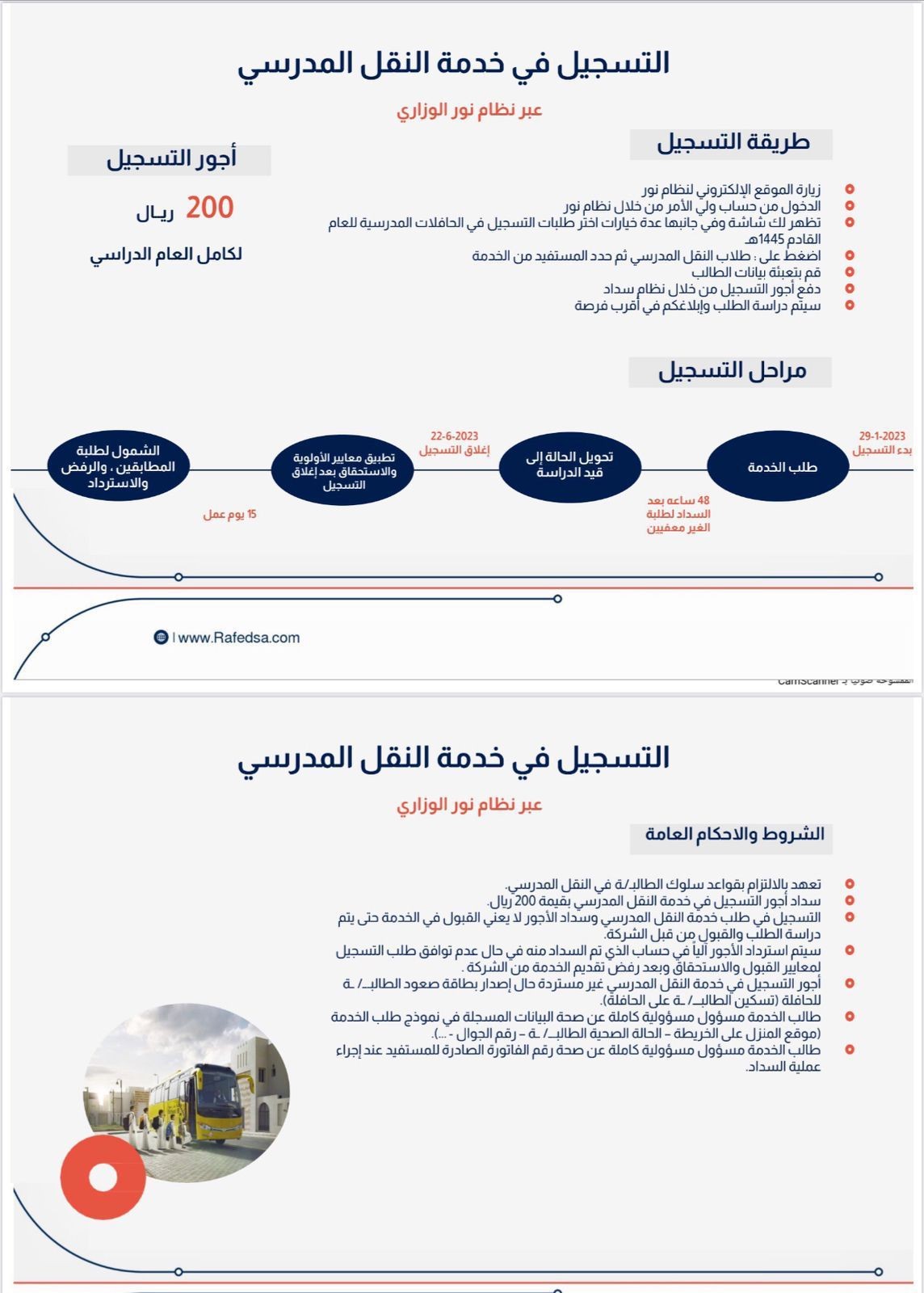 استعداداً لبداية العام الدراسي الجديد 1445هـ ؛ اطلع المدير العام للتعليم بمنطقة مكة المكرمة الأستاذ الدكتور أحمد بن محمد الزائدي اليوم على خدمة النقل المدرسي ؛ واستعدادات شركة تطوير لخدمات النقل ( رافد ) للعام الدراسي الجديد 1445هـ والحملة التوعوية للتعريف بالنقل المدرسي قبل إغلاق التسجيل بتاريخ 4 ذو الحجة 1444هـ.