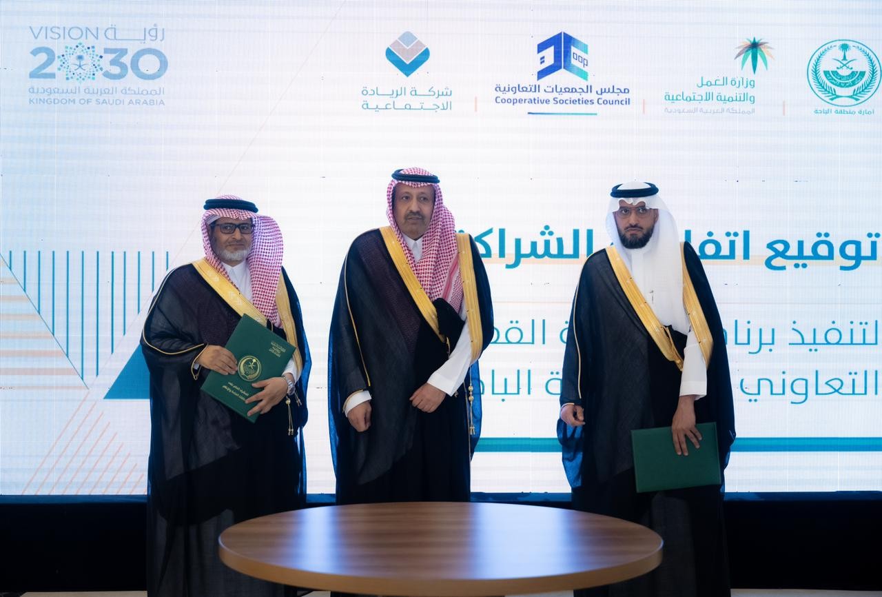 وفي ختام الحفل شهد سمو أمير منطقة الباحة توقيع اتفاقيات الشراكة بين شركة الريادة الاجتماعية ومجلس الجمعيات التعاونية, ووزارة الموارد البشرية والتنمية الاجتماعية.