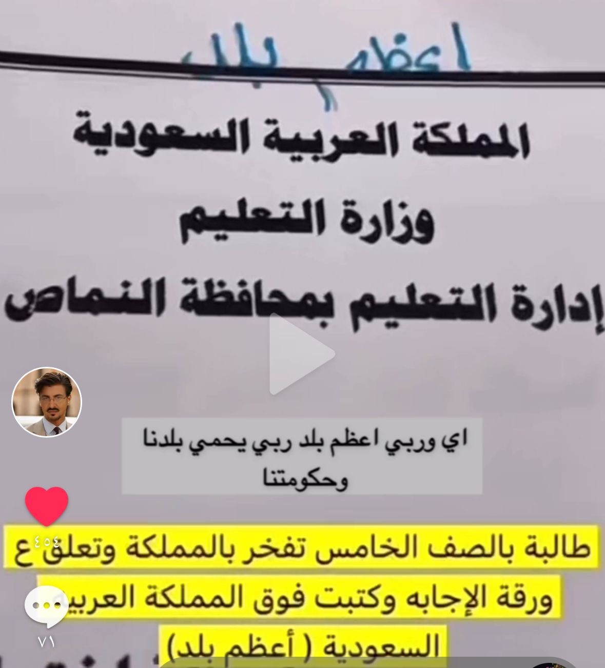التي اعتزت وافتخرت بوطنها وتعليقها على ورقة الإجابه عند اسم المملكه العربيه السعوديه (اعظم بلد)