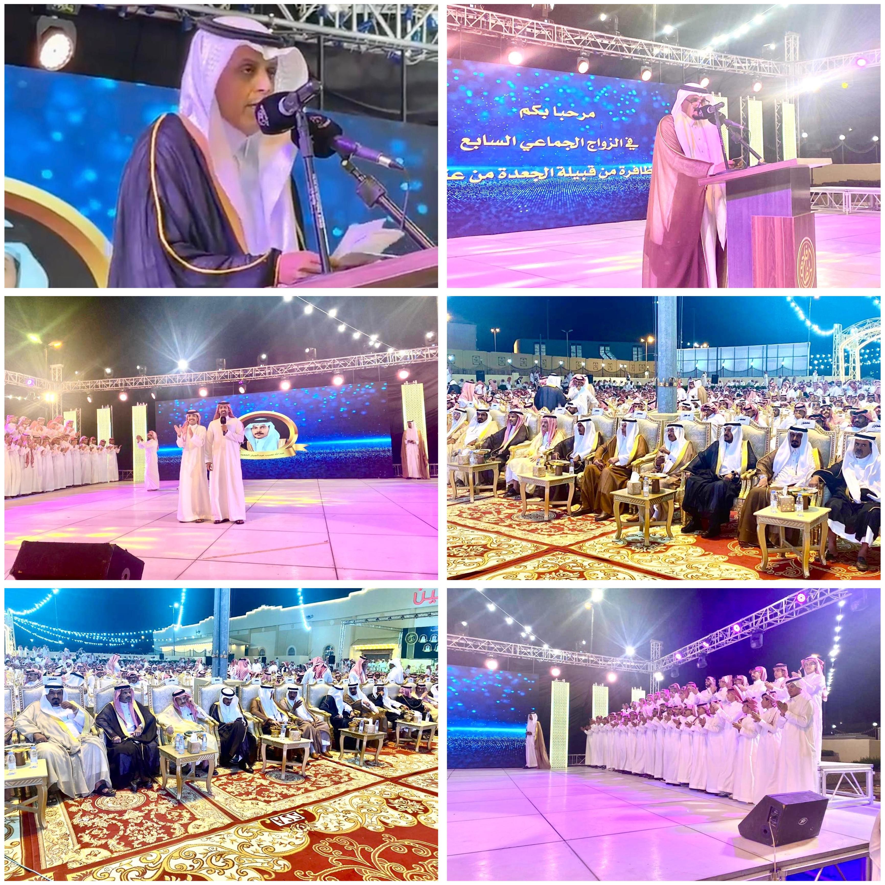 وقدَّمَ مدير فرع هيئة الصحفيين السعوديين بمحافظة الطائف، مدير مكتب صحيفة مكة بالمحافظة، الإعلامي الأستاذ عطاالله مسفر الجعيد، الحفل الخطابي، الذي بدأ بآيات عطرة من كتاب الله الكريم، تلاها المُهندس أيمن ضيف الله الجعيد، ثم ألقى شيخ قبيلة الجعدة، الشيخ عائض سائر عنيبر الجعيد، كلمة استهلها بالترحيب بالضيوف، مُقدماً شكره وعظيم امتنانه باسمه وباسم مشايخ وأعيان القبيلة، لشيخ خامس المظافرة الشيخ مسيفر صويلح الجعيد، وعموم أفراد الخامس، على هذا الإنجاز العظيم وهو مشروع الزواج الجماعي الذي يقام كل عام، مُقدِّماً شكره كذلك إلى عموم اللجان التي أشرفت ونفذت هذا العمل الجليل، راجياً من العلي القدير أن يكتب تلك الأعمال الجليلة في ميزان حسناتهم، وأضاف،"نرجو من بقية مشايخ القبيلة تبني مشروع الزواج الجماعي، والعمل على تنفيذه لما له من فوائد عظيمة تعود بالنفع على أبناء القبيلة، كما يسعدنا أن نتقدم بأجمل التهاني والتبريكات إلى فرسان هذه الليلة وذويهم ونقول لهم كما قال الرسول صلى الله عليه وسلم بارك الله لكم وبارك عليكم وجمع بينكم في خير، راجياً من العلي القدير أن يحفظ ولاة أمرنا وأن يحفظ وطننا من كيد الكائدين، وحسد الحاسدين".