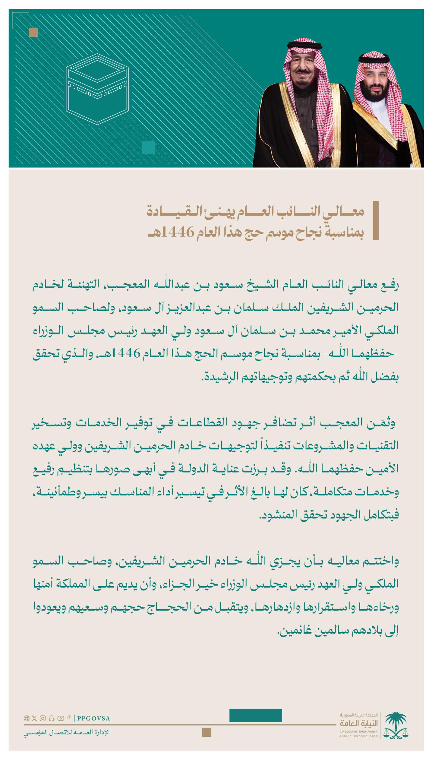 رفع معالي النائب العام الشيخ سعود بن عبدالله المعجب، التهنئة لخادم الحرمين الشريفين الملك سلمان بن عبدالعزيز آل سعود، ولصاحب السمو الملكي الأمير محمد بن سلمان آل سعود ولي العهد رئيس مجلس الوزراء -حفظهما الله- بمناسبة نجاح موسم الحج هذا العام 1446هـ، والذي تحقق بفضل الله ثم بحكمة وتوجيهات القيادة الرشيدة.
