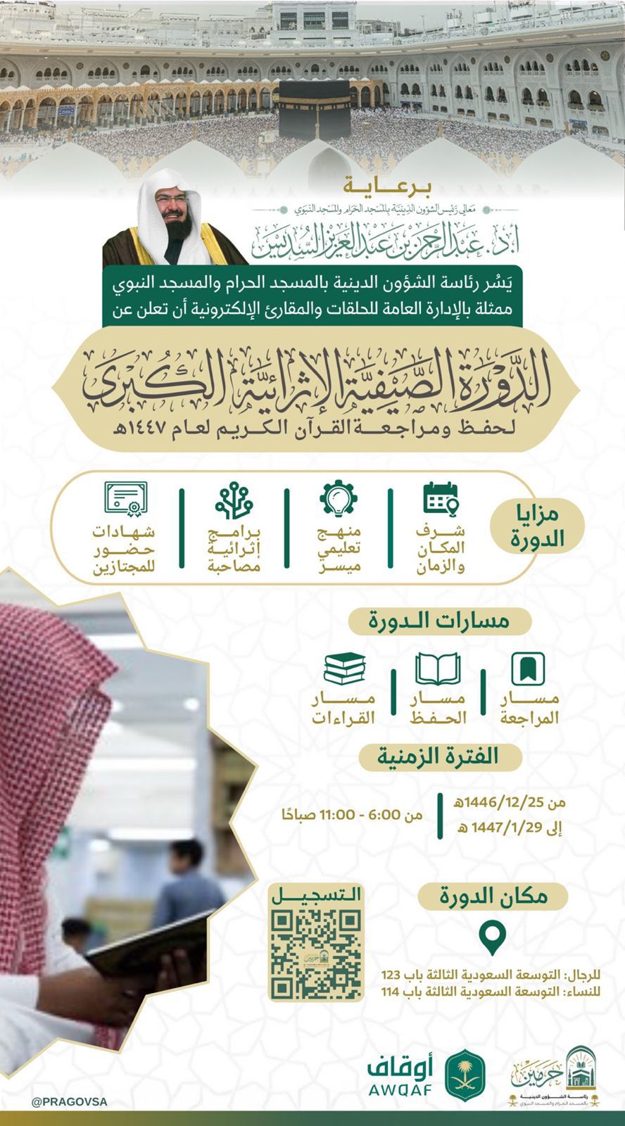 حرصت رئاسة الشؤون الدينية بالمسجد الحرام والمسجد النبوي على استثمار المواسم الدينية لبث رسالة القرآن الكريم الوسطية وهداياته للعالمين، ولإثراء تجربة القاصدين والمعتمرين التعبّدية؛ حيث أعلنت الرئاسة عن تنظيم الدورة الصيفية الإثراية الكبرى لحفظ ومراجعة القرآن الكريم، برعاية معالي رئيس الشؤون الدينية الشيخ الدكتور عبدالرحمن السديس، والتي ستنطلق من 1446/12/25هـ إلى 1447/1/29هـ بالمسجد الحرام في التوسعة السعودية الثالثة بجوار باب 123.