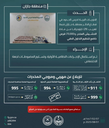 أحبطت الدوريات البرية لحرس الحدود في قطاع الدائر بمنطقة جازان تهريب (29) كلجم من مادة الحشيش المخدر، و(70,000) قرص خاضع لتنظيم التداول الطبي، وجرى استكمال الإجراءات النظامية الأولية، وتسليم المضبوطات لجهة الاختصاص.