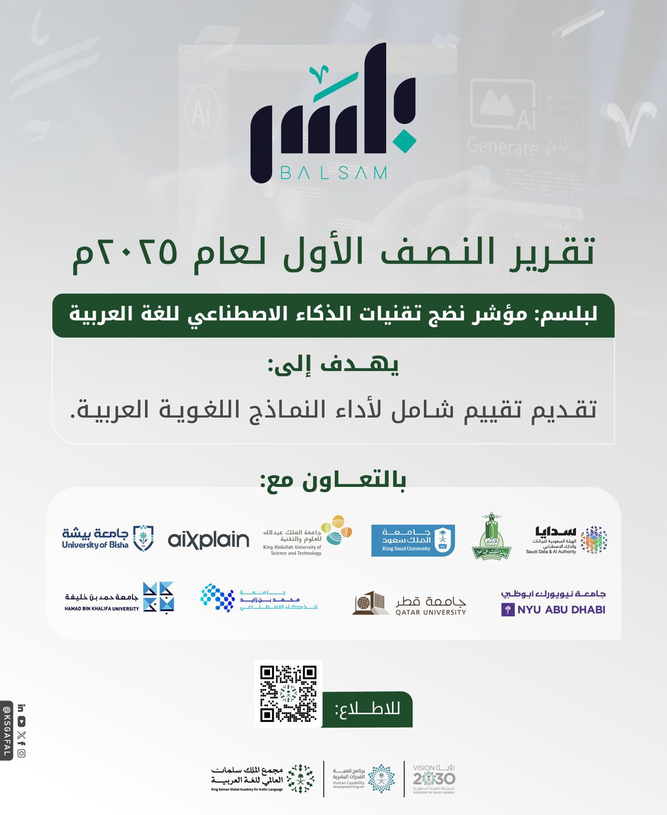 أطلق مجمع الملك سلمان العالمي للغة العربية تقرير النصف الأول من عام 2025م لمؤشر نضج تقنيات الذكاء الاصطناعي للغة العربية "بلسم"؛ يهدف إلى تقييم أداء النماذج اللغوية الضخمة (LLMs) في مجموعة من مهام معالجة اللغة الطبيعية، عبر منصة موحدة تُيسّر على المطورين والباحثين فهم أداء النماذج في المجالات اللغوية المختلفة.
