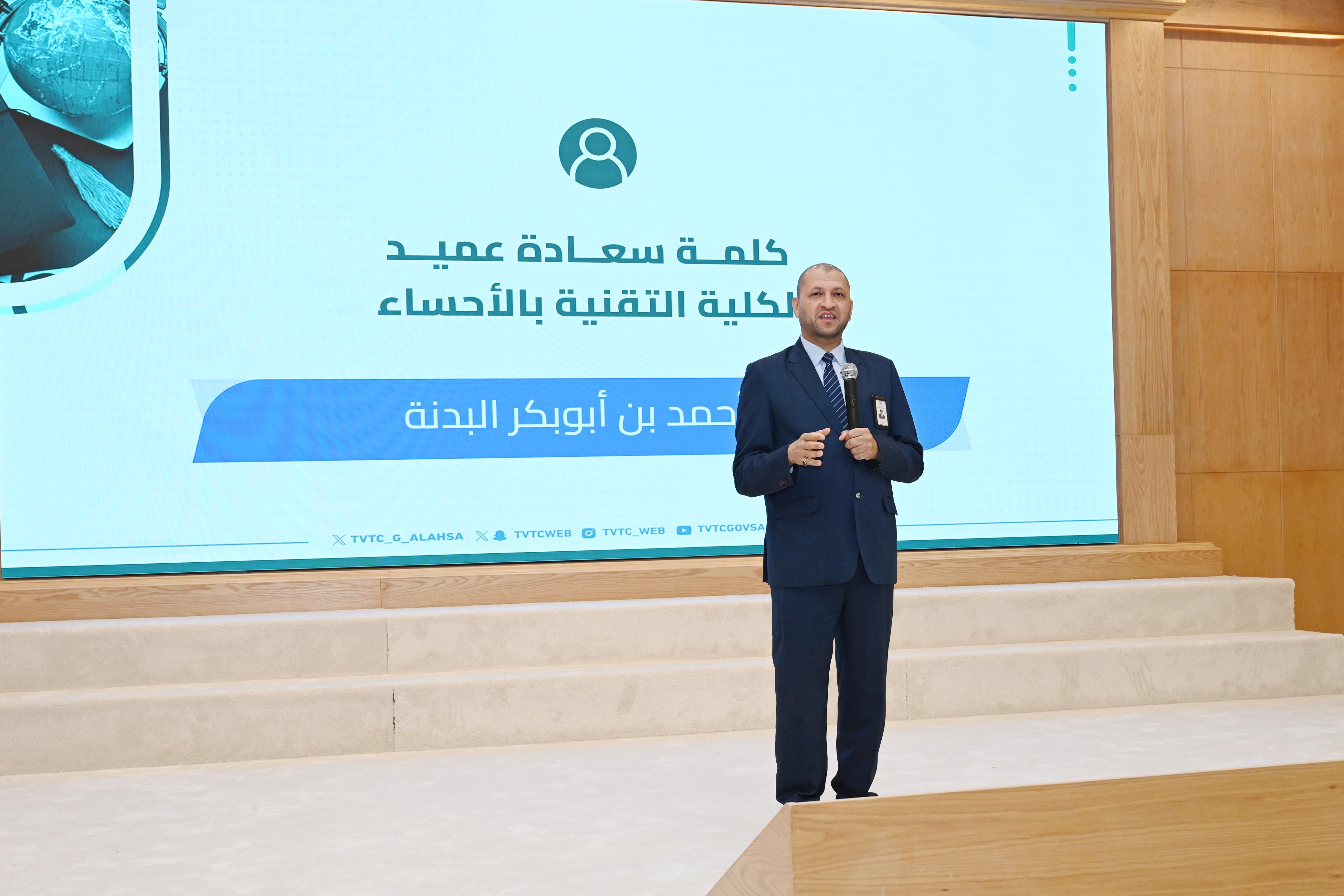 وأكد البدنة على أهمية أن يكون للمتدربين بصمة واضحة في جميع الأنشطة والفعاليات والمبادرات التي تنفذها الكلية، مشيرًا إلى أن هذا الفصل التدريبي شهد توسعًا في الطاقة الاستيعابية ورقمًا قياسيًا بقبول أكثر من (2450) متدربًا، وهو ما يتوافق مع المستهدفات الإستراتيجية للمؤسسة العامة للتدريب التقني والمهني لاستيعاب أكبر عدد من الراغبين في الالتحاق بالتدريب، والمساهمة في تحقيق التنمية المستدامة من خلال تأهيل وتطوير الكوادر الوطنية وفق احتياجات سوق العمل الكمية والنوعية. كما أوضح أن هذا الدعم يأتي بفضل الله تعالى، ثم بفضل الدعم السخي من حكومة خادم الحرمين الشريفين وسمو ولي عهده الأمين – حفظهما الله – لقطاع التدريب التقني والمهني، وكذلك الدعم اللامحدود التي تحضى به الكلية من أصحاب السعادة نواب محافظ المؤسسة العامة للتدريب التقني والمهني ، وبمتابعة مستمرة من سعادة مدير عام الإدارة العامة للتدريب التقني والمهني بالمنطقة الشرقية الأستاذ مشاري بن عبدالله القحطاني.