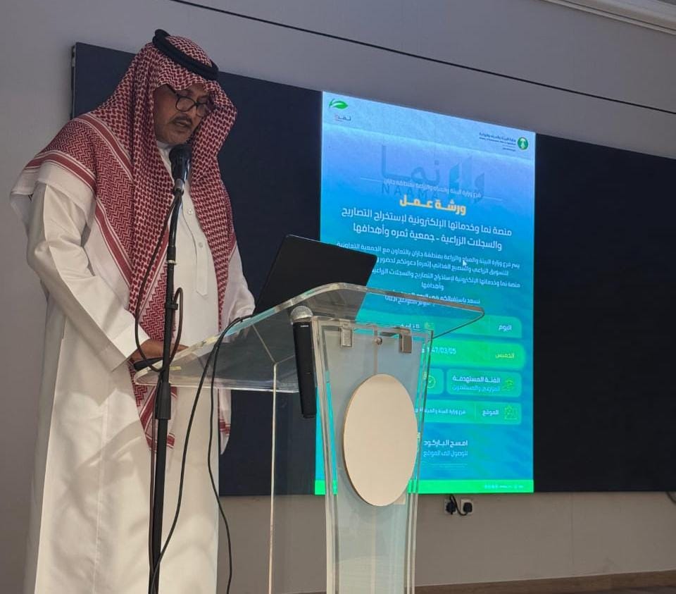 م. سامي حكمي ورشة عمل بعنوان "منصة نما وخدماتها الإلكترونية لإصدار التصاريح والسجلات الزراعية" في قاعة التدريب التابعة لفرع الوزارة .