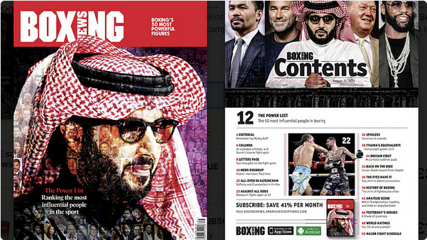 في إنجاز جديد يؤكد التحولات الكبيرة التي تشهدها الرياضة السعودية، تصدر معالي المستشار تركي آل الشيخ، رئيس الهيئة العامة للترفيه، قائمة Boxing News البريطانية لأكثر 50 شخصية مؤثرة في عالم الملاكمة للعام الثاني على التوالي. هذا الاختيار، الذي احتل غلاف المجلة العريقة، هو بمثابة شهادة دولية على الدور المحوري الذي تلعبه المملكة في إعادة تشكيل خريطة الملاكمة العالمية.