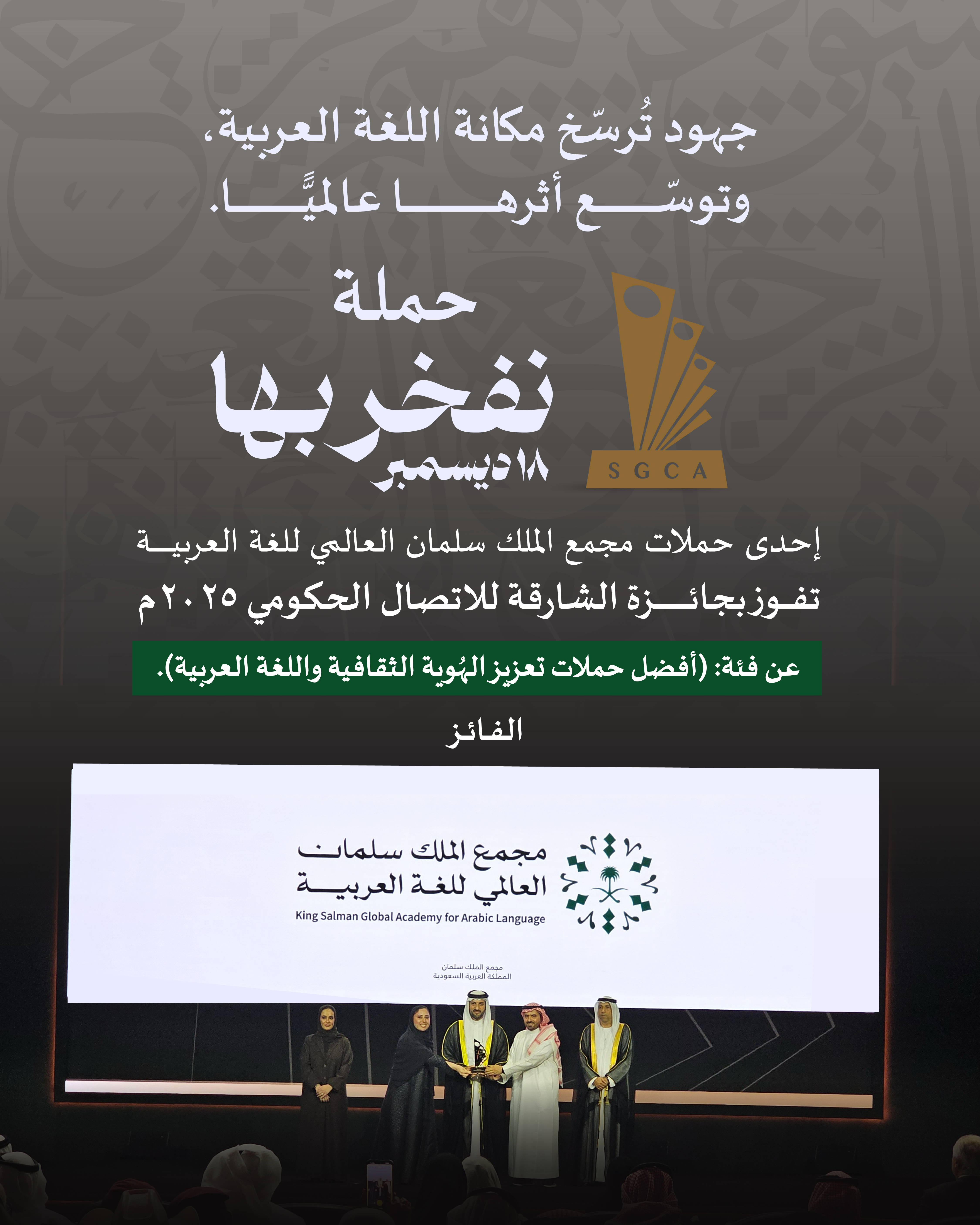 مجمع الملك سلمان العالمي للغة العربية يحصد جائزة الشارقة للاتصال الحكومي 2025 عن حملته (نفخر بها)