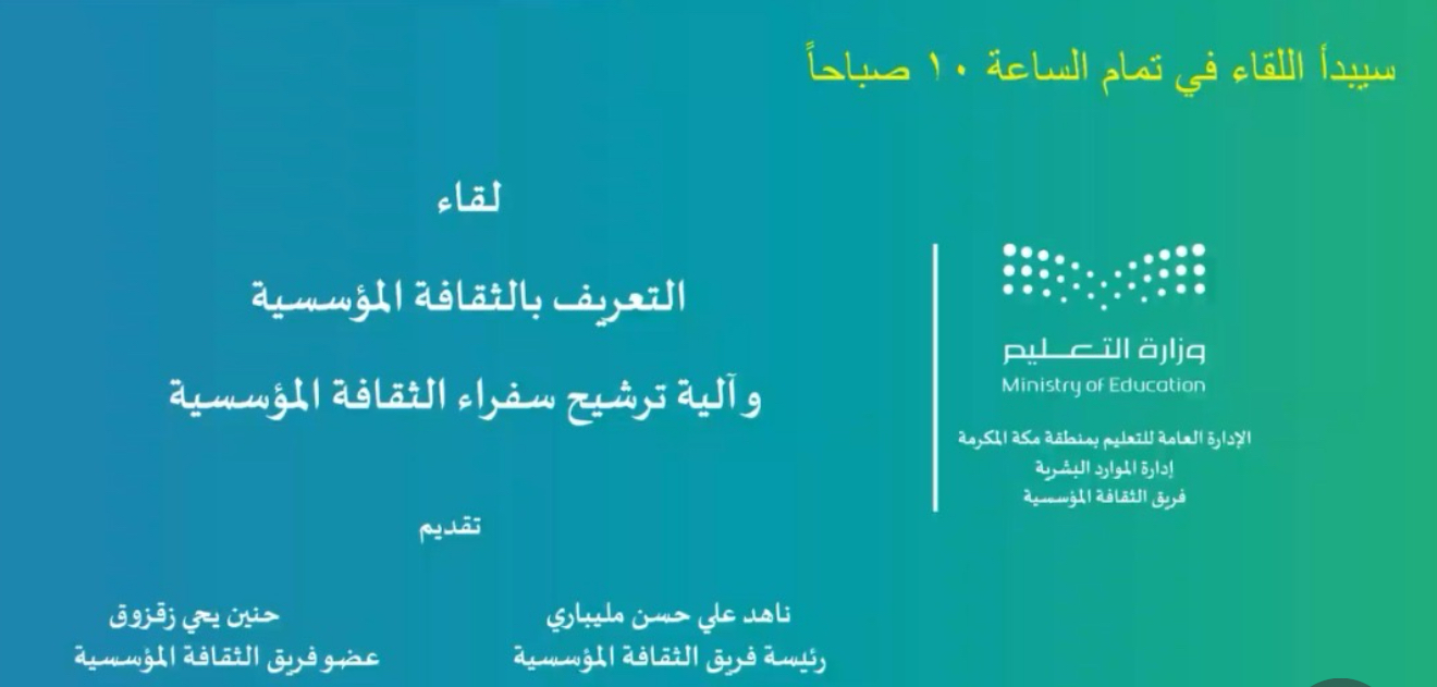 نفذت الإدارة العامة للتعليم بمنطقة مكة المكرمة ممثلة في إدارة الموارد البشرية -قسم الثقافة المؤسسية – يوم الاثنين 23/03/1447هــ لقاءً بعنوان "آلية ترشيح سفراء الثقافة المؤسسية" بالإدارةالعامة للتعليم بمنطقة مكة المكرمة ومحافظاتها، نفذه قسم الثقافة المؤسسية وذلك بهدف العمل على إنشاء قاعدة بيانات سفراء الثقافة المؤسسية للإدارات والوحدات والأقسام والمدارس والروضات والطفولة المبكرة،  وتعزيزا للقيم ونشرها بين الموظفين مما يساهم في تحقيق نتائج مرضية في الصحة التنظيمية والارتباط الوظيفي.