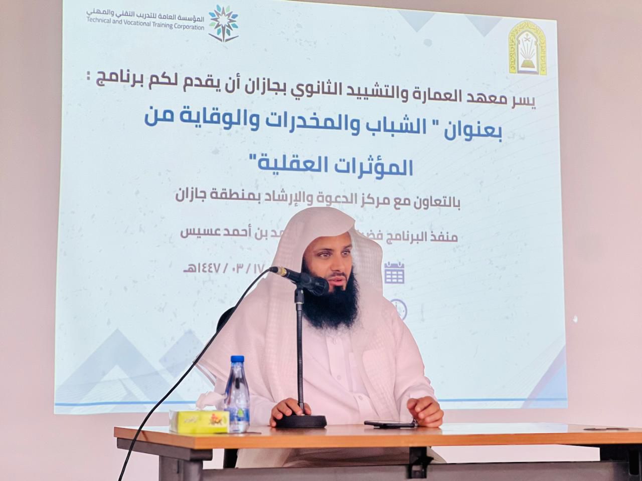 شارك فرع وزارة الشؤون الإسلامية والدعوة والإرشاد في منطقة جازان ممثلاً بدعوة مدينة جيزان في البرنامج التوعوي ( الوقاية من التدخين والمؤثرات العقلية - الشباب والمخدرات - ) الذي أطلقه معهد العمارة والتشييد الثانوي .
