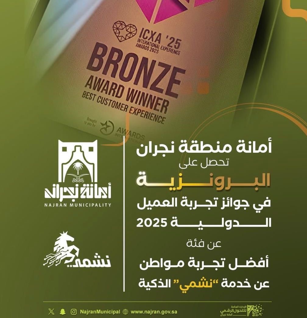 أمانة منطقة نجران تحصد الجائزة البرونزية في الجوائز الدولية لتجربة العملاء (ICXA 2025)