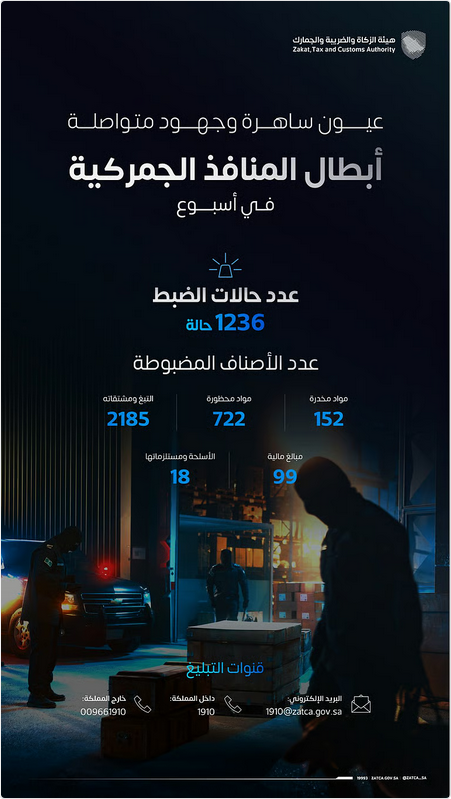 ودعت "زاتكا" في الوقت ذاته الجميع إلى الإسهام في مكافحة التهريب لحماية المجتمع والاقتصاد الوطني، من خلال التواصل معها على الرقم المخصص للبلاغات الأمنية (1910) أو عبر البريد الإلكتروني (1910@zatca.gov.sa) أو الرقم الدولي (009661910)، حيث تقوم الهيئة من خلال هذه القنوات باستقبال البلاغات المرتبطة بجرائم التهريب ومخالفات أحكام نظام الجمارك الموحد وذلك بسرية تامة، مع منح مكافأة مالية للمُبلّغ في حال صحة معلومات البلاغ.