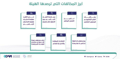 وأوضحت الهيئة أن من أبرز تلك المخالفات؛ مخالفات النشر الإلكتروني للمحتوى الإعلامي، وتأجيج التعصب الرياضي، وبيع محتوى أو أجهزة إعلامية مقرصنة، والإعلانات المضللة والاحتيال المالي.