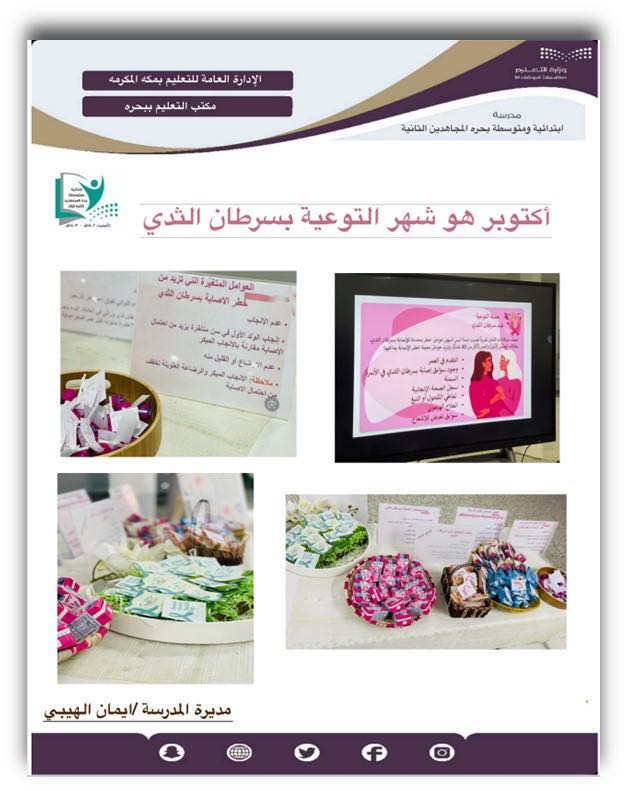 فيما تناول البرنامج عدة محاور منها: إعداد برنامج متكامل يوضح أهمية الكشف المبكر المجّاني عن سرطان الثدي، صاحبه تجهيز ركن بعنوان التوعية بأهمية الكشف المبكر عن سرطان الثدي، والتغريد في حساب المدرسة.