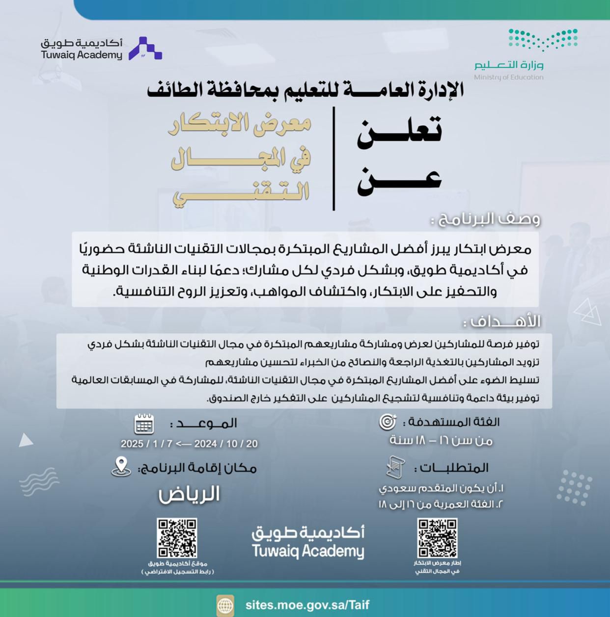 دعت الإدارة العامة للتعليم بمحافظة الطائف الطلاب والطالبات في المرحلة الثانوية الموهوبين في مجال التقنية المشاركة في معرض الابتكار في المجال التقني، الذي أطلقته أكاديمية طويق في الفترة من 20 أكتوبر 2024 إلى 1 يناير 2025 في مقرها بالرياض.