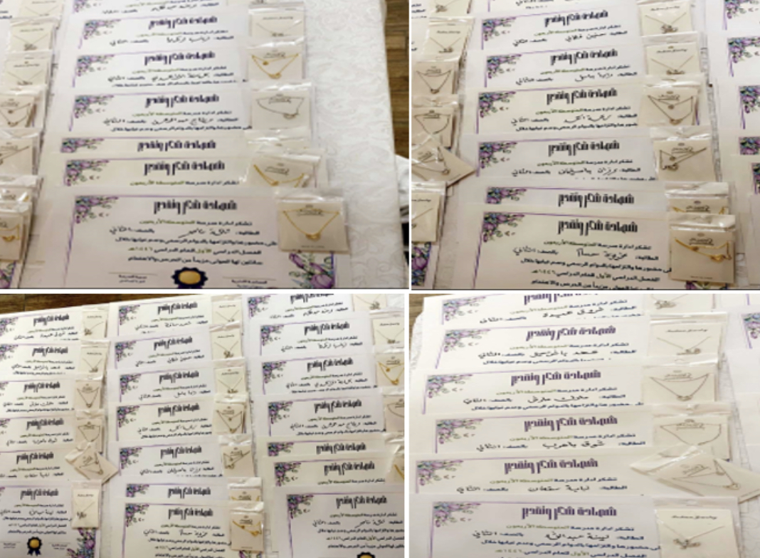 وبعد ذلك اختتم بتقديم الشهادات التقدير والهدايا التذكارية للمنضبطات، وتم طرح العديد من التوصيات والمقترحات والتي جاءت على النحو التالي: متابعة الطالبات المكرمات بعد الحفل، وتقديم الدعم اللازم لهن لمواصلة تميزهن ، وإنشاء جدار شرف في المدرسة لعرض أسماء الطالبات المكرمات، وتأسيس نادي للطالبات المتميزات، يهدف إلى تبادل الخبرات والمعرفة بينهن، وتنظيم أنشطة مشتركة.