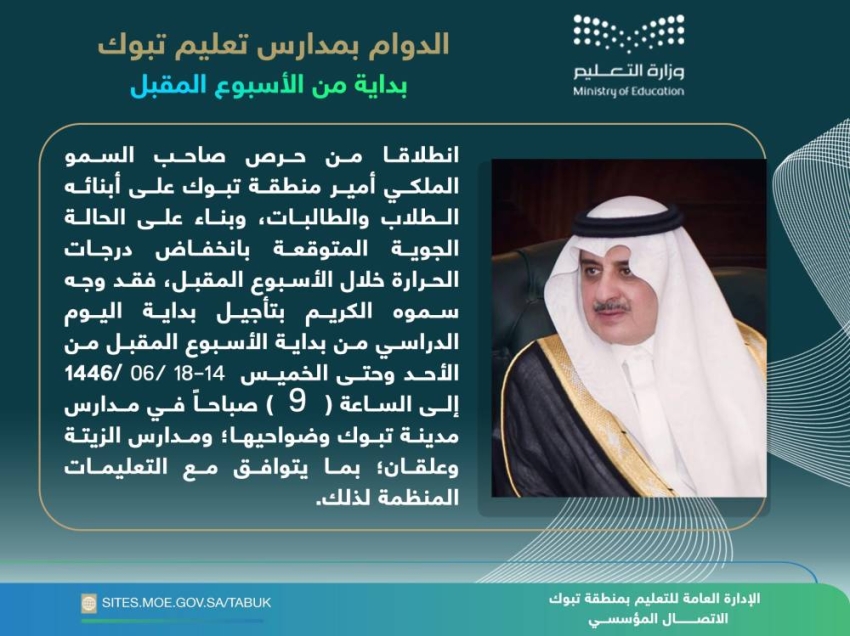وجه صاحب السمو الملكي الأمير فهد بن سلطان بن عبدالعزيز أمير منطقة تبوك بتأخير بداية اليوم الدراسي إلى الساعة (9) صباحًا بدءًا من يوم غد وحتى يوم الخميس القادم في مدارس مدينة تبوك وضواحيها، ومدارس مركزي الزينة وعلقان.