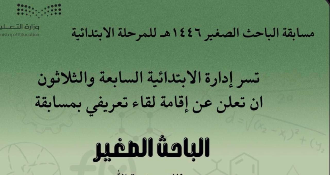نفذت الابتدائية السابعة والثلاثون التابعة لمكتب تعليم الشوقية بالإدارة العامة للتعليم بمنطقة مكة المكرمة، اللقاء التعريفي عن مسابقة الباحث الصغير للطالبات الموهوبات، يوم الأحد 7 /6 /1446 هـ، بقاعة الوفاء بالمدرسة، نفذته منسقة الموهوبات أمل المولد ، ورائدة النشاط حواء الهوساوي، بمتابعة قائدة المدرسة نورغلام، لتهيئة الطالبات للمشاركة في مسابقة الباحث الصغير، ودعم وتنمية مهارات البحث العلمي لدى الطالبات الموهوبات بالمرحلة الابتدائية.