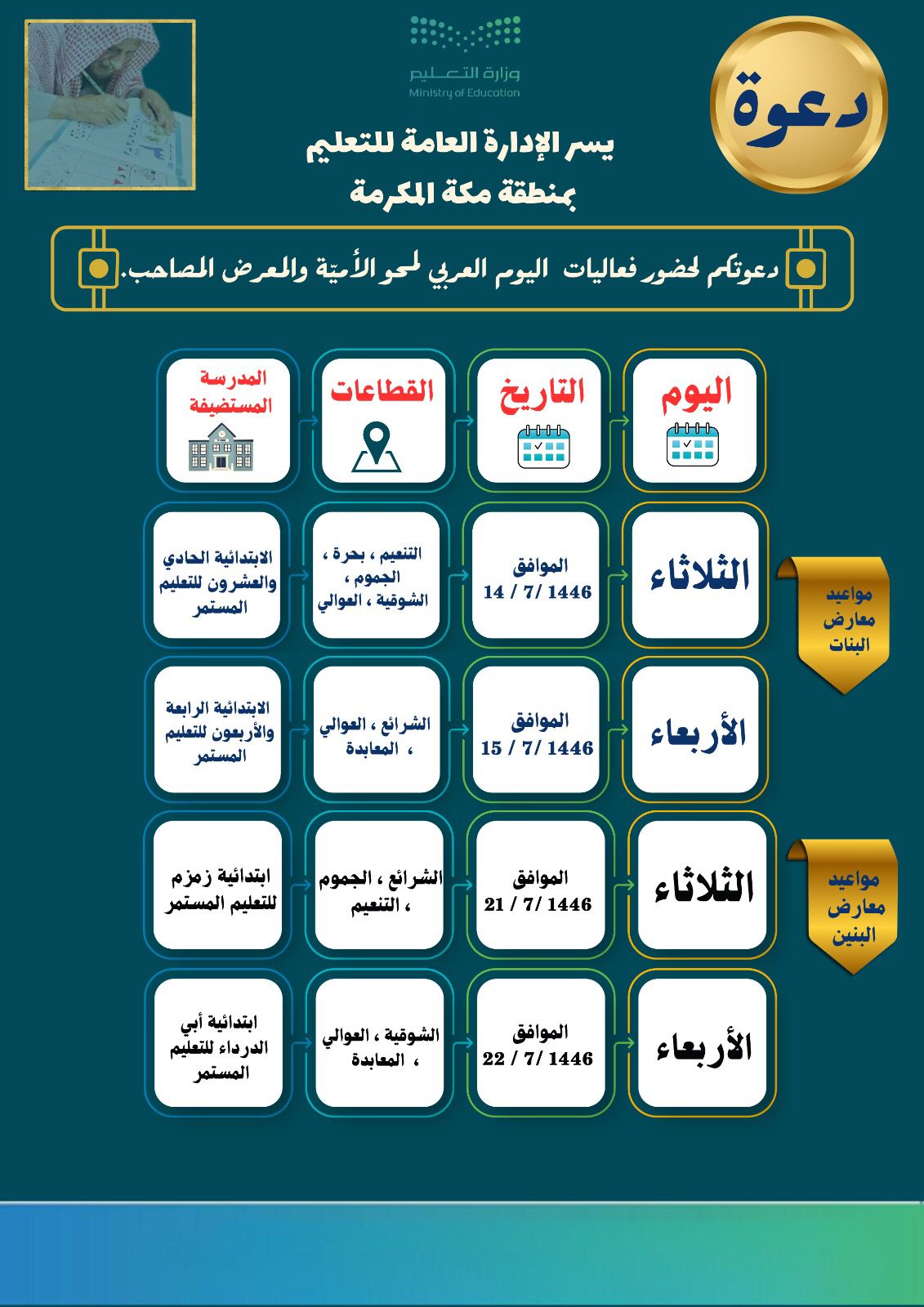 أطلقت الإدارة العامة للتعليم بمنطقة مكة المكرمة ممثلة في الشؤون التعليمية - أداء التعليم - قسم التعليم المستمر اليوم الثلاثاء وحتى الأربعاء 14 -20 / 7 / 1446 فعاليات اليوم العربي لمحو الأمية وذلك في كلٍ من : الابتدائية الحادية والعشرين ، والابتدائية الرابعة والأربعين للتعليم المستمر ، ابتدائية زمزم ، وابتدائية أبي الدرداء ؛ بمشاركة 50 مدرسة للتعليم المستمر في مكة المكرمة.