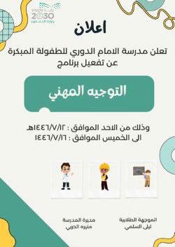 نفذت مدرسة الإمام الدوري للطفولة المبكرة التابعة لمكتب تعليم بحرة بالإدارة العامة للتعليم بمنطقة مكة المكرمة، يوم الخميس 16 / 7 / 1446هـ، برنامج التوجيه المهني بعنوان "مسابقة مهن وقيم" ، نفذته الموجهة الطلابية بالتعاون مع رائدات الفصول، ومساندة من مديرة المدرسة وأولياء الأمور، استهدف فيه طلاب المدرسة في الفصول الدراسية، لتعزز مشاركة الأسرة في تعلم أبنائهم، والإسهام في تحقيق التوافق التعليمي والمهني للطلبة .