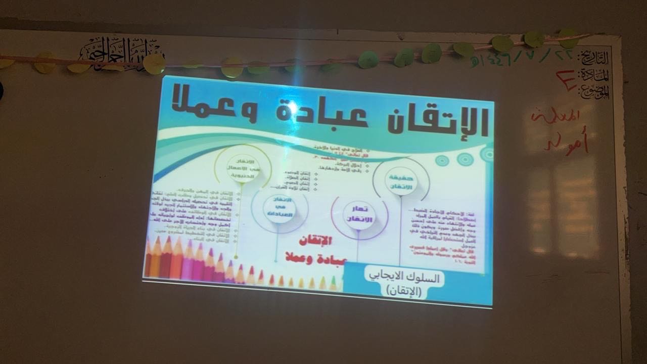 أقامت ابتدائية حفصة ينت عمر التابعة لمكتب تعليم الشوقية بالإدارة العامة للتعليم بمنطقة مكة المكرمة، يوم الاحد الموافق :26/7/1446هـ واستمر حتى يوم الخميس الموافق 30/7/1446هـ، برنامجا تثقيفيا بعنوان "أسعد بسلوكي الاتقان" ، من تنفيذ معلمات السلوك الإيجابي بمساندة إدارة المدرسة، استهدف فيه طالبات المدرسة، لتعزيز السلوك الإيجابي لدى الطالبات، وتعزيز ثقافة قيمة الاتقان لدى الطالبات، وتأصيل الممارسات والمبادرات الإيجابية، ونشر الوعي بأهمية قيمة الاتقان وممارستها في المجتمع التعليمي، وحث الطالبات على الاتقان في جميع الأمور، وتشجيع الطالبات على الانضباط المدرسي .