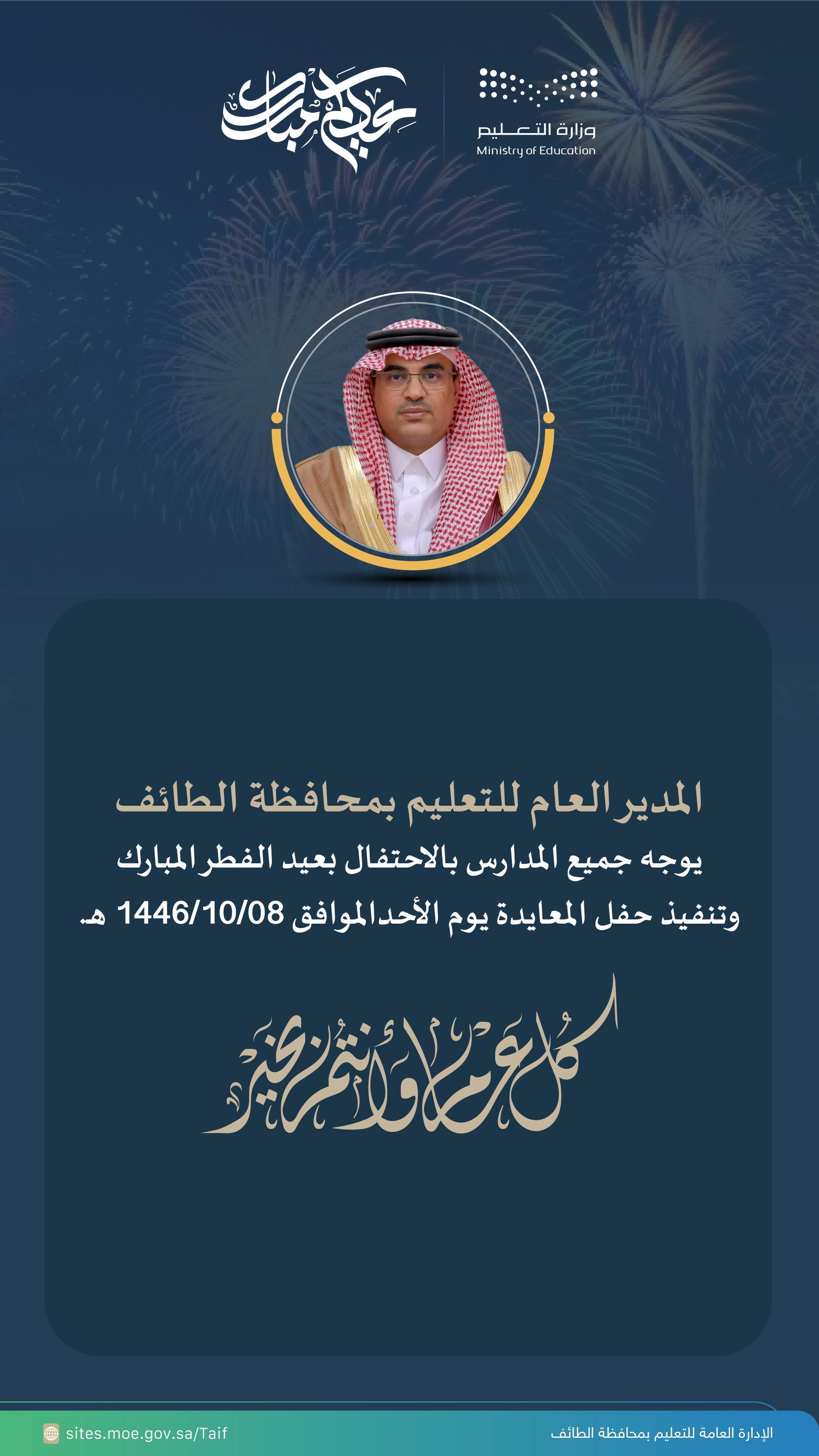 يحتفل أكثر من ربع مليون طالب وطالبة في 1700 مدرسة في الإدارة العامة للتعليم بالطائف غداً الأحد 8 شوال 1446هـ بعيد الفطر المبارك بمشاركة الطلبة ومنسوبيها بفعاليات متنوعة وذلك بهدف نشر البهجة والألفة والسرور بين الطلبة فرحاً بعيد الفطر السعيد، وإبراز مظاهر الاحتفال بالعيد السعيد، وكذلك تقوية العلاقات الاجتماعيّة، بالإضافة إلى التهيئة والاستعداد لإكمال الفصل الدراسي الثالث، والحرص على نشر أجواء من الراحة والطمأنينة في نفوس الطلبة للعودة بنشاط وهمة عالية .
