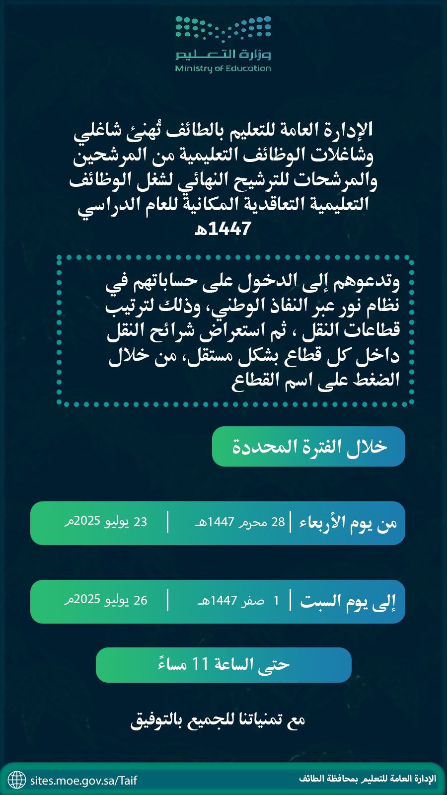 تعليم الطائف : 4 أيام لترتيب قطاعات النقل للمرشحين والمرشحات للوظائف التعليمية التعاقدية المكانية