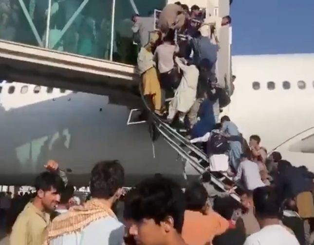 وظهر خلال الفيديو الأفغان وهم يتزاحمون داخل المطار ويتسلقون سلم إحدى الطائرات بشكل عشوائي ومعظمهم لم يكن حاملاً لحقيبة سفر .