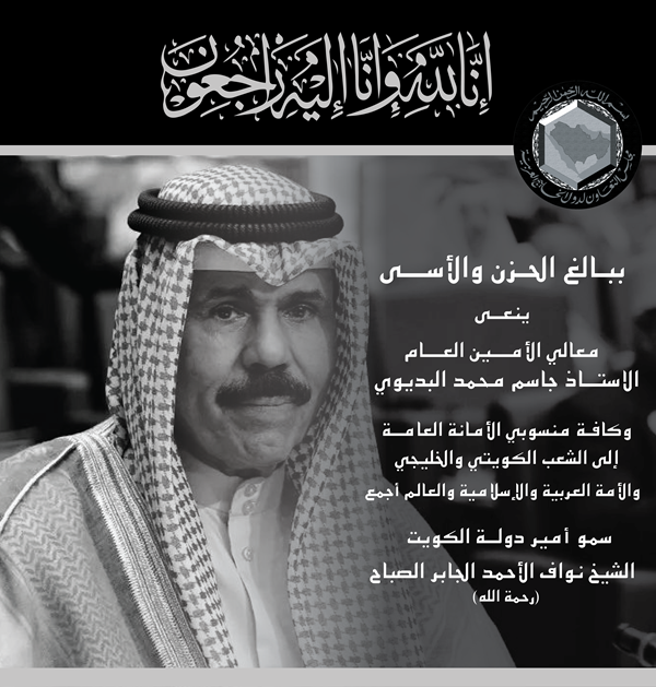قال معالي الأستاذ جاسم محمد البديوي، الأمين العام لمجلس التعاون لدول الخليج العربية، أنه وبقلوب راضية بقضاءِ الله وقدره، وبأفئدة مليئةٍ بالحزن والألم، ننعى حضرة صاحب السمو الشيخ  نواف الأحمد الجابر الصباح، أمير دولة الكويت، طيّب الله ثراه، متوجهين إلى حضرة صاحب السمو الشيخ  مشعل الأحمد الجابر الصباح، وإلى أسرة الصباح الكريمة، والشعب الكويتي، والشعوب الخليجية قاطبة، بأحر التعازي، وأصدق عبارات المواساة، في وفاة المغفور له بإذن الله تعالى.