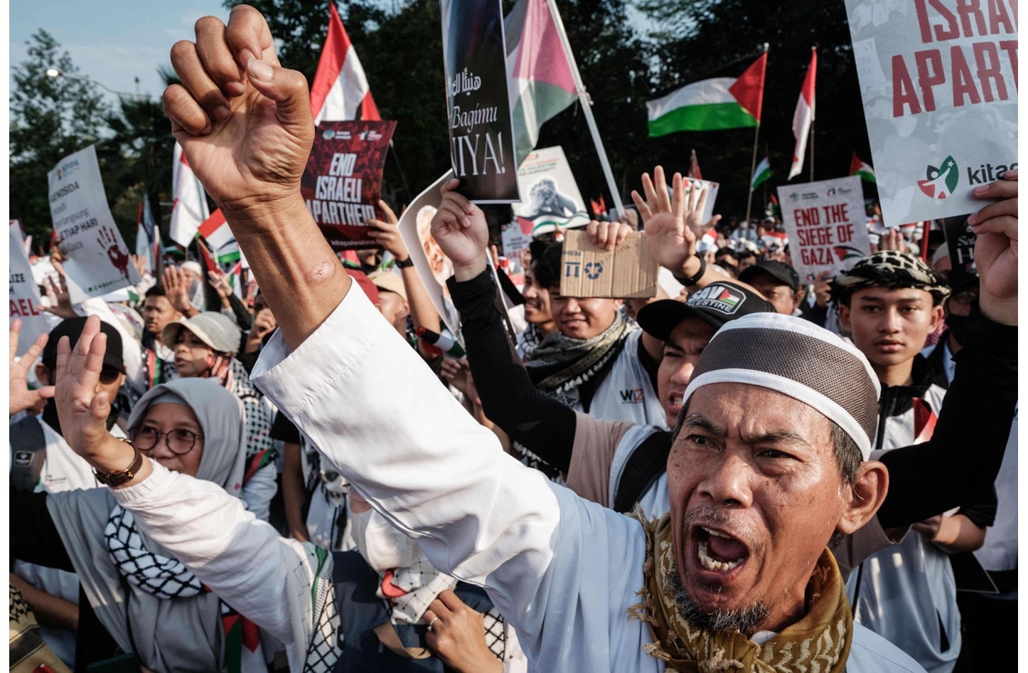 نظم متظاهرون، تابعون لـ «تحالف المدافعين الإندونيسيين عن فلسطين»، مظاهرة سلمية أمام سفارة الولايات المتحدة، في وسط جاكرتا، للتعبير عن دعمهم لفلسطين.