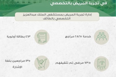 الطائف - هلال اليزيدي بلغ عدد الخدمات المقدمة للمراجعين والمرضى في إدارة تجربة المريض بمستشفى الملك عبدالعزيز التخصصي بالطائف 20825...