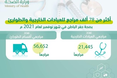 حفر الباطن - فتحيه عبدالله قدمت صحة حفر الباطن ممثلة بمستشفياتها خدماتها العلاجية والتشخيصية لـ78,097 مراجعاً خلال شهر نوفمبر لعام 2021...