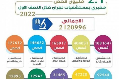 أجرت أقسام المختبرات وبنوك الدم بمستشفيات صحة نجران 2120996 فحصاً مخبرياً خلال النصف الأول من العام الجاري 2022. ....