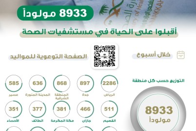 أوضحت وزارة الصحة أن إجمالي عدد المواليد في المملكة بلغ 8933 مولوداً، خلال الفترة من 25 -01- 1444هـ وحتى...