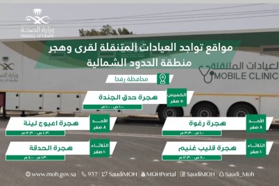 حددت الشؤون الصحية بمنطقة الحدود الشمالية مواقع وجود العيادات المتنقلة لهجر وقرى محافظة العويقيلة لتوسيع نطاق الخدمات الصحية مما...