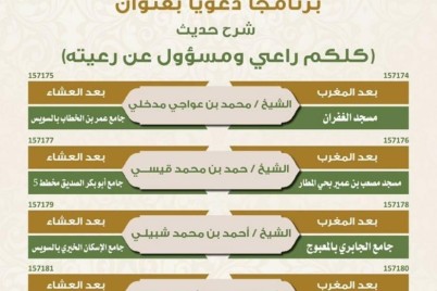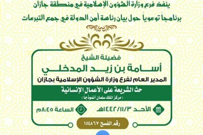 جازان - عادل عمر تنظم وزارة الشؤون الإسلامية والدعوة والإرشاد ممثلة بفرعها في منطقة جازان برنامجاً دعوياً تحت عنوان "...