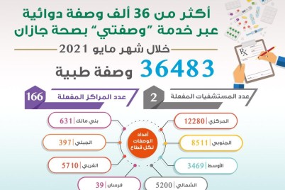 جازان - عادل مجرشي أوضحت صحة جازان أن الوصفات الطبية المصروفة خلال شهر مايو الماضي بلغت 36483 وصفة طبية عن...