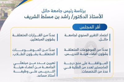 حائل - عبير الشمري عقد مجلس جامعة حائل جلسته الثالثة للعام الجامعي 1443هـ، هذا اليوم الثلاثاء، برئاسة رئيس الجامعة،...