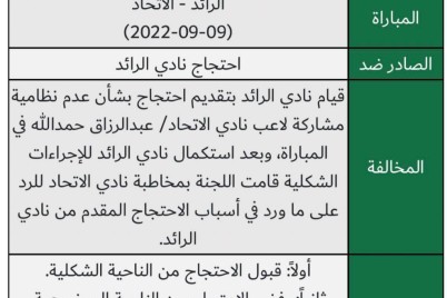الحدث - سعد المصبح أعلنت لجنة الانضباط والأخلاق بالاتحاد السعودي لكرة القدم رفض احتجاج فريق الرائد على فريق الاتحاد بعد...