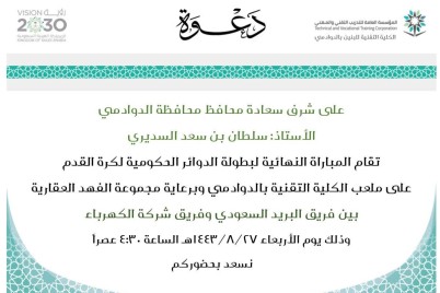 الدوادمي - زياد العتيبي برعاية محافظ الدوادمي سلطان السديري تقام المباراة النهائية لبطولة الدوائر الحكومية لكرة القدم بين فريقي البريد...