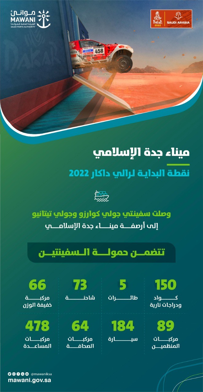 وتُوجت جهود "موانئ" مؤخرًا باستقبال ميناء جدة الإسلامي خلال شهر ديسمبر الجاري لسفينتي "جولي كوارزو" و"جولي تيتانيو" المحملتين بأكثر من 1100 مركبة متنوعة و5 طائرات و 20 حاوية للمشاركة في النسخة الـ 44 لرالي داكار2022؛ الرالي الأعرق والأكثر تحدياً في عالم رياضة المحركات الذي تستضيفه المملكة مطلع العام المقبل.