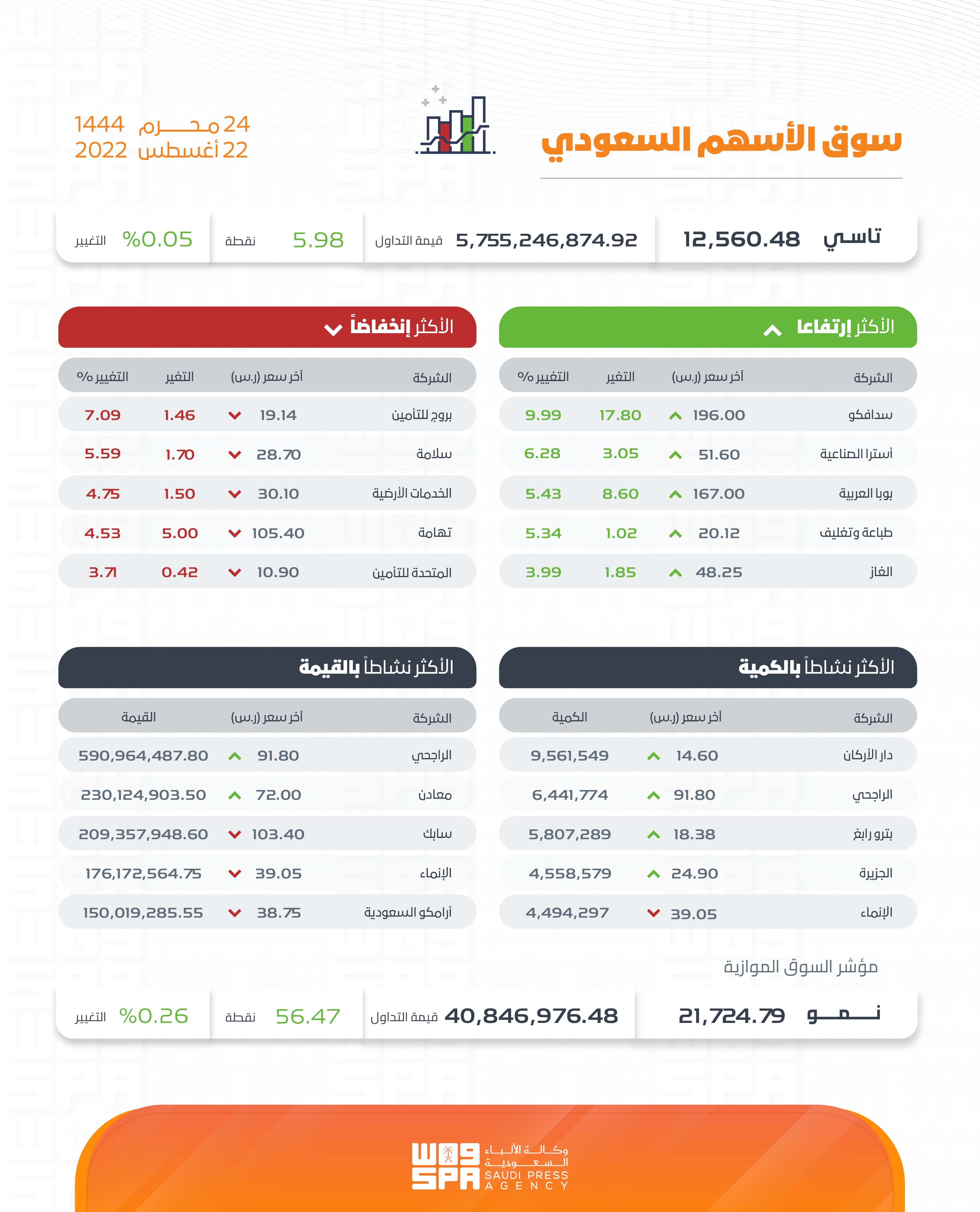 أغلق مؤشر الأسهم السعودية الرئيس اليوم مرتفعًا 5.98 نقاط ليقفل عند مستوى 12560.48 نقطة, بتداولات بلغت قيمتها 5.7 مليارات ريال.