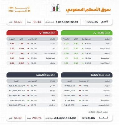 : أغلق مؤشر الأسهم السعودية الرئيس اليوم منخفضًا 191.34 نقطة ليقفل عند مستوى 11566.45 نقطة, وبتداولات بلغت قيمتها 3.8 مليارات ريال.