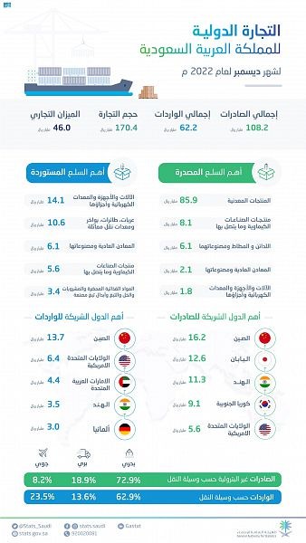 الهيئة العامة للإحصاء: ارتفاع الصادراتِ السلعيَّة للمملكة خلال شهر ديسمبر 2022م بنسبة 1%