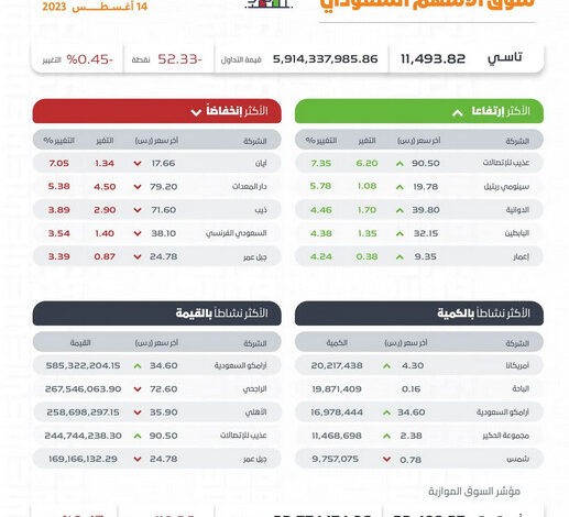 وكانت أسهم شركات: عذيب للاتصالات، وسينومي ريتيل، والدوائية، والبابطين، وإعمار الأكثر ارتفاعًا, أما أسهم شركات: أيان، ودار المعدات، وذيب، والسعودي الفرنسي، وجبل عمر الأكثر انخفاضًا في التعاملات, حيث تراوحت نسب الارتفاع والانخفاض ما بين 7.35% و7.05%.