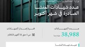 أصدرت وزارة الصناعة والثروة المعدنية 38,988 “شهادة منشأ” خلال شهر أكتوبر الماضي، وذلك في إطار سعيها لدعم الخدمة وتسهيلها على المصدرين في مختلف القطاعات سواء الصناعي، أو التجاري، أو قطاع الأفراد.